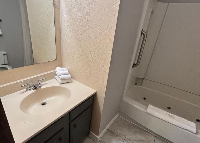 This cozy two-bedroom, two-bathroom condo features a gas fireplace in the open concept living, kitchen, dining room with sliding glass door leading out to your private patio. The master bedroom has a queen bed with a full en suite bathroom, TV with free cable and private patio. The second bedroom has two twin beds, a private patio and a full bathroom just outside the door that is shared with the queen sofa sleeper in the living room. Both bathrooms include a hairdryer and a selection of bath soaps. The 1st floor corner unit has a fully equipped kitchen that includes a full-size refrigerator, oven with range top, microwave, drip coffee maker and more. This unique resort property combines the space and conveniences of a two bedroom condominium with many of the amenities and services frequently found in a hotel setting.